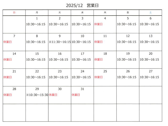 2025年12月 営業日のご案内